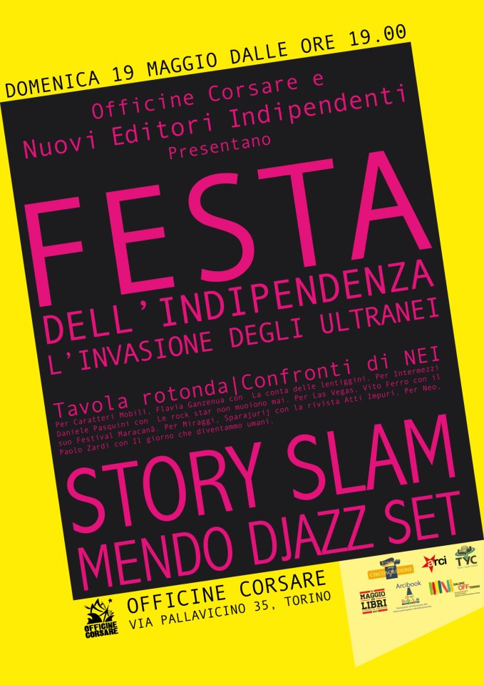E domenica 19 maggio dalle 19 in poi presso le Officine Corsare in Via Pallavicino 35 bis: Festa dell’Indipendenza – L’invasione del UltraNei, ovvero la festa in occasione del Salone dei Nuovi Editori Indipendenti.