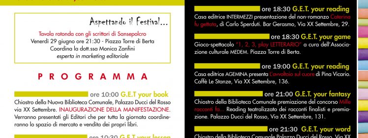 Sabato 30 giugno Intermezzi partecipa al G.E.T. Festival – Festival della Giovane Editoria Toscana a Sansepolcro (AR) con un proprio spazio espositivo. Alle 18:30 nell’ambito del festival ci sarà la presentazione di Caterina fu gettata di Carlo Sperduti, presso il Bar Gerasmo in Via XX Settembre 29. Questo il programma completo della giornata (clicca sull'immagine per ingrandirla!).